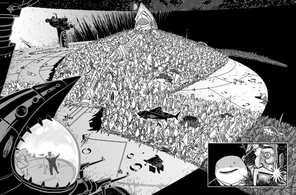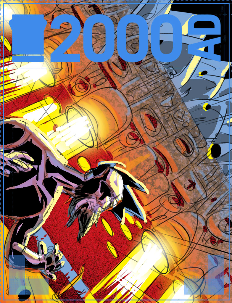 D’ISRAELI, aka Matt Brooker, is one of the sickest artists out there. He’s currently illustrating the Dirty Frank strip Low Life in 2000AD, which has recently (and shockingly) been intricately linked to two other Dreddworld strips in the series – it’s all about to climax in prog 1812, out next Wednesday.